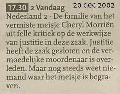 "Met dank aan 2vandaag is er een nieuw impuls gekomen m.b.t. oplossing van de verdwijning van Cheryl Morriën. Door inmenging van Boris Dittrich zijn er kamer vragen gesteld." Buro Zoeklicht.