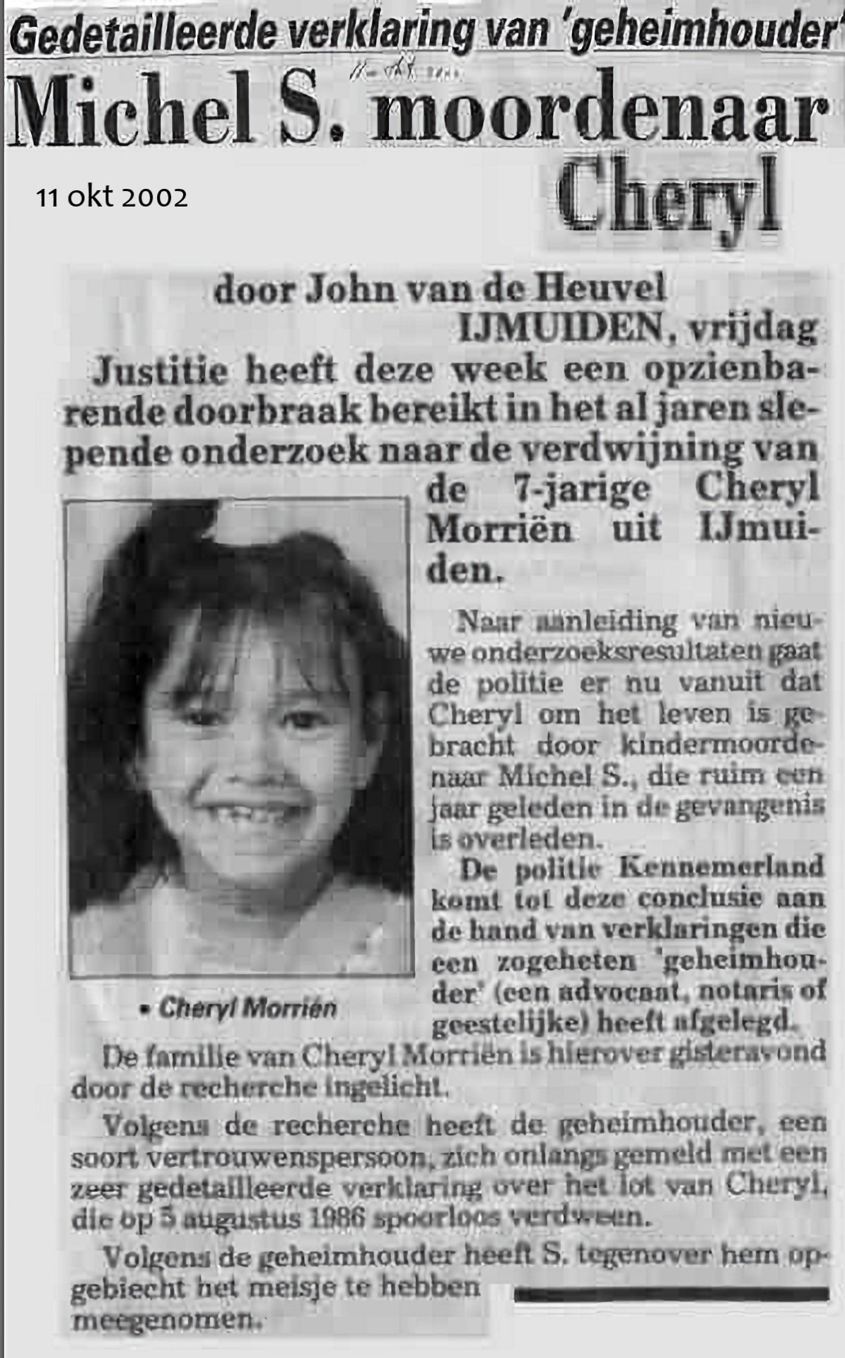 HILVERSUM (ANP) - De familie van het verdwenen meisje Cheryl Morriën uit IJmuiden wil dat justitie de identiteit van twee anonieme tipgevers bekendmaakt. Volgens de politie leidden de tips tot de oplossing van de verdwijningszaak.